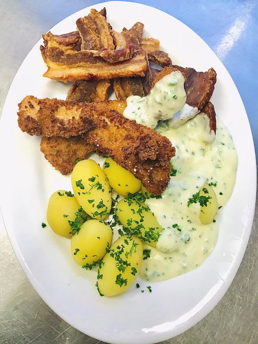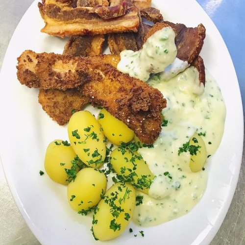 | Stegt flæsk Vælg mellem stegt, paneret eller røget flæsk med kartofler, persillesovs, rødbeder og sennep |