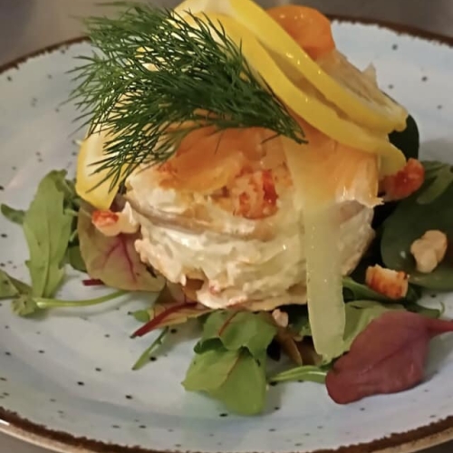 | Dyrekølle Salat, cashewnødder, peberrodscreme, brød og smør |