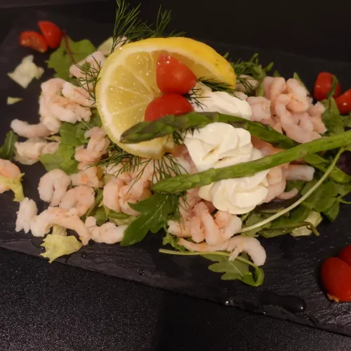 | Rejer på brød Salat, cherrytomat, asparges og mayonnaise |